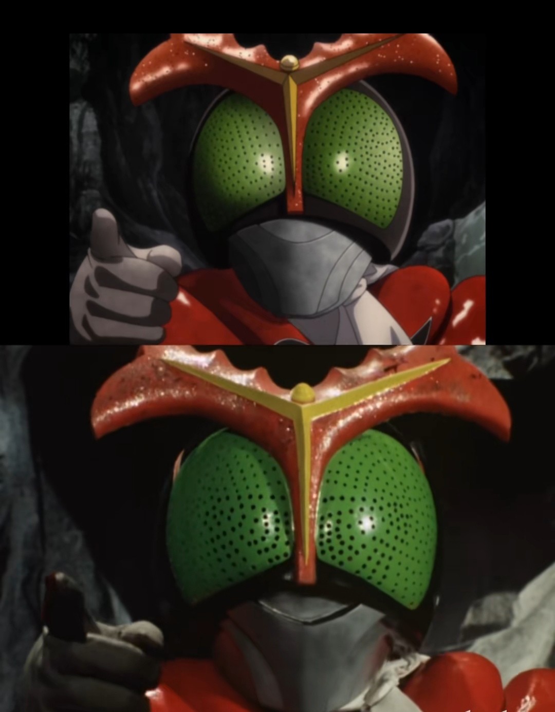 最后呢聊聊动画里的小细节,动画中的回忆部分中穿插着昭和《假面骑士》系列TV的一些片段,出现的片段基本上是1:1的用动画复刻了,效果还是非常不错的。