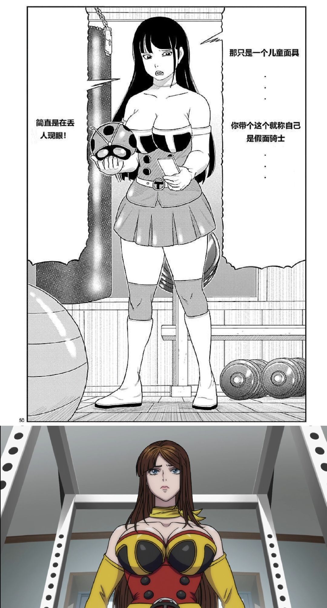 对《假面骑士强人》的分镜复刻,上为动画下为原剧