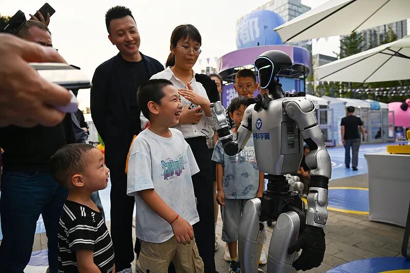 潮玩大街上,市民游客与机器人互动。(图/视觉中国)