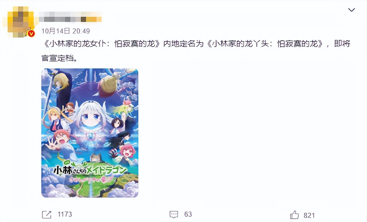 值得一提的是,除了《新世纪福音战士》以外,近期还有一部日本动画电影也被传要引进国内,这部电影就是《小林家的龙女仆》的剧场版《怕寂寞的龙》。而有意思的是,根据网友的爆料,这部剧场版引进国内后也会被改名,改成《小林家的龙丫头:怕寂寞的龙》。