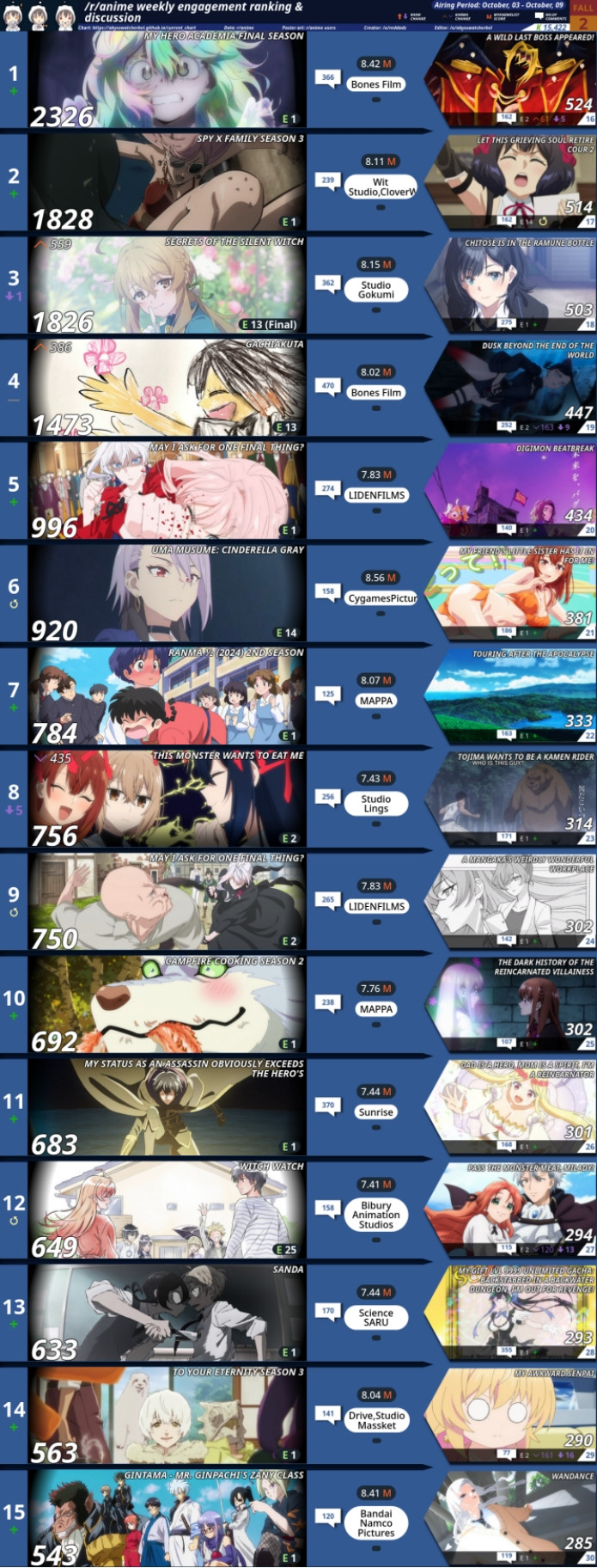 Reddit社区热度榜是从10月1日开始算,现在是第二周,讨论度前十依次为:鬼子学院、间谍过家家、沉默魔女、废渊战鬼、武斗派千金、 赛马娘 栗帽灰姑娘 第2部分、乱马2/1、水产爱上我、第九位跟第五重复了,吧,是重复了吧……第十是拥有超常技能的异世界流浪美食家 第二季,一拳超人何在,第二周还没出来的么……
