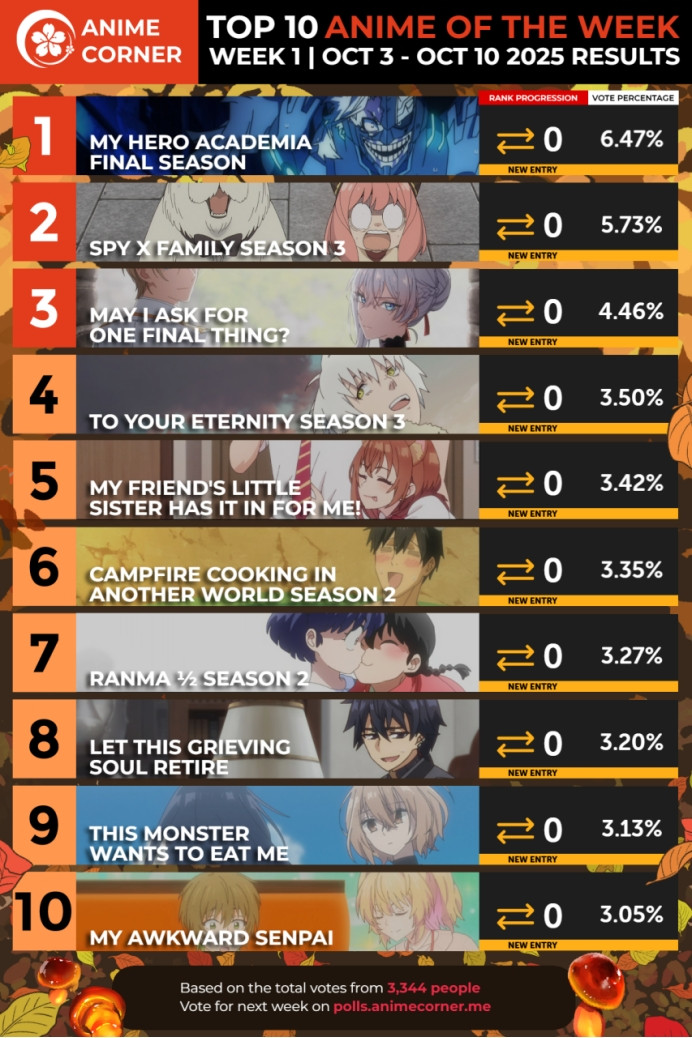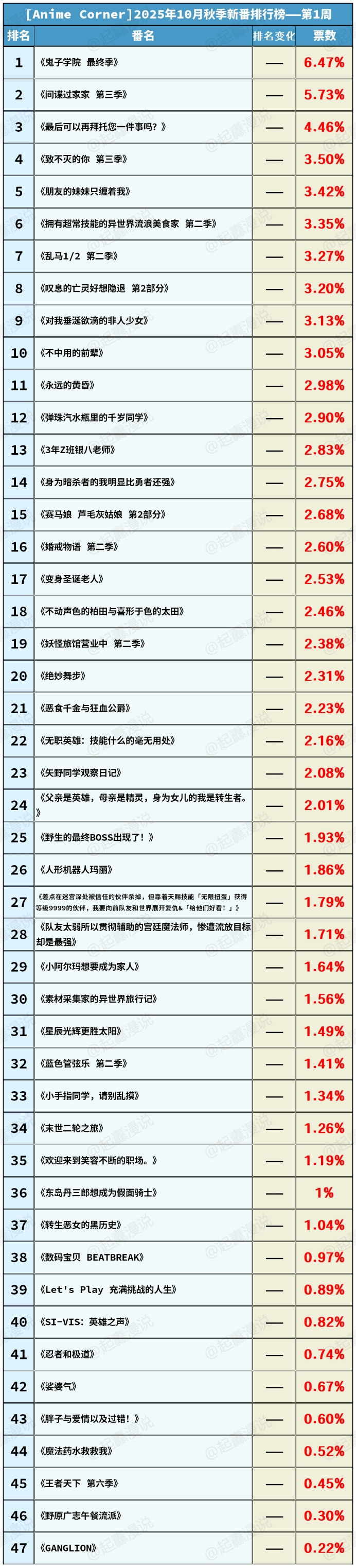 Anime Corner秋季动漫第1周排行取自三千余名国际动漫迷投票。