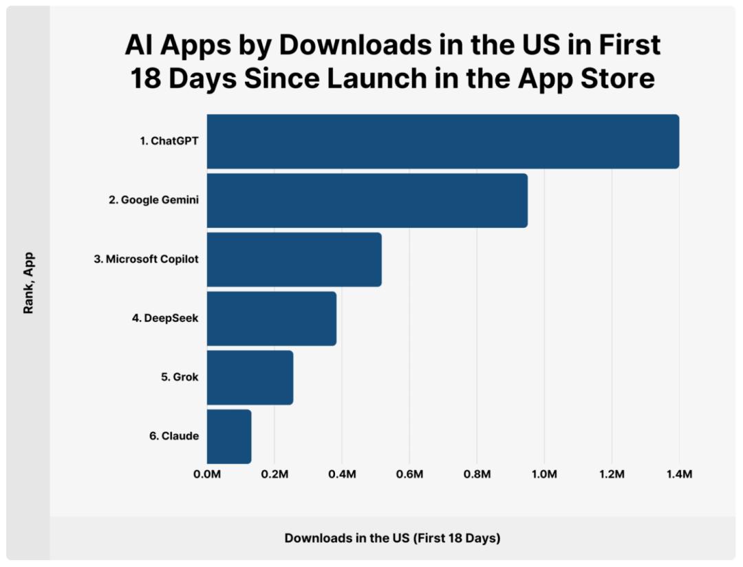 除此之外,「每款应用发布后前18天内在下载量」的数据统计中,Grok甚至打不过年初发布的DeepSeek。