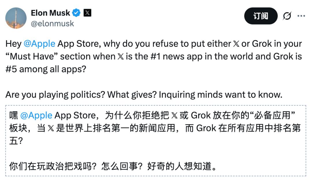 因为Grok不能登上苹果的App Store,马斯克扬言要起诉苹果!