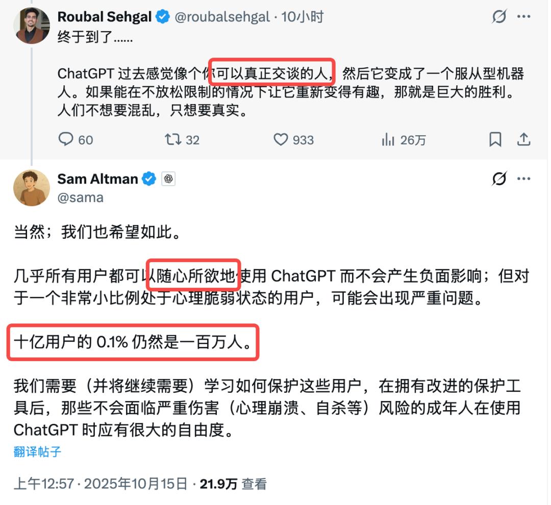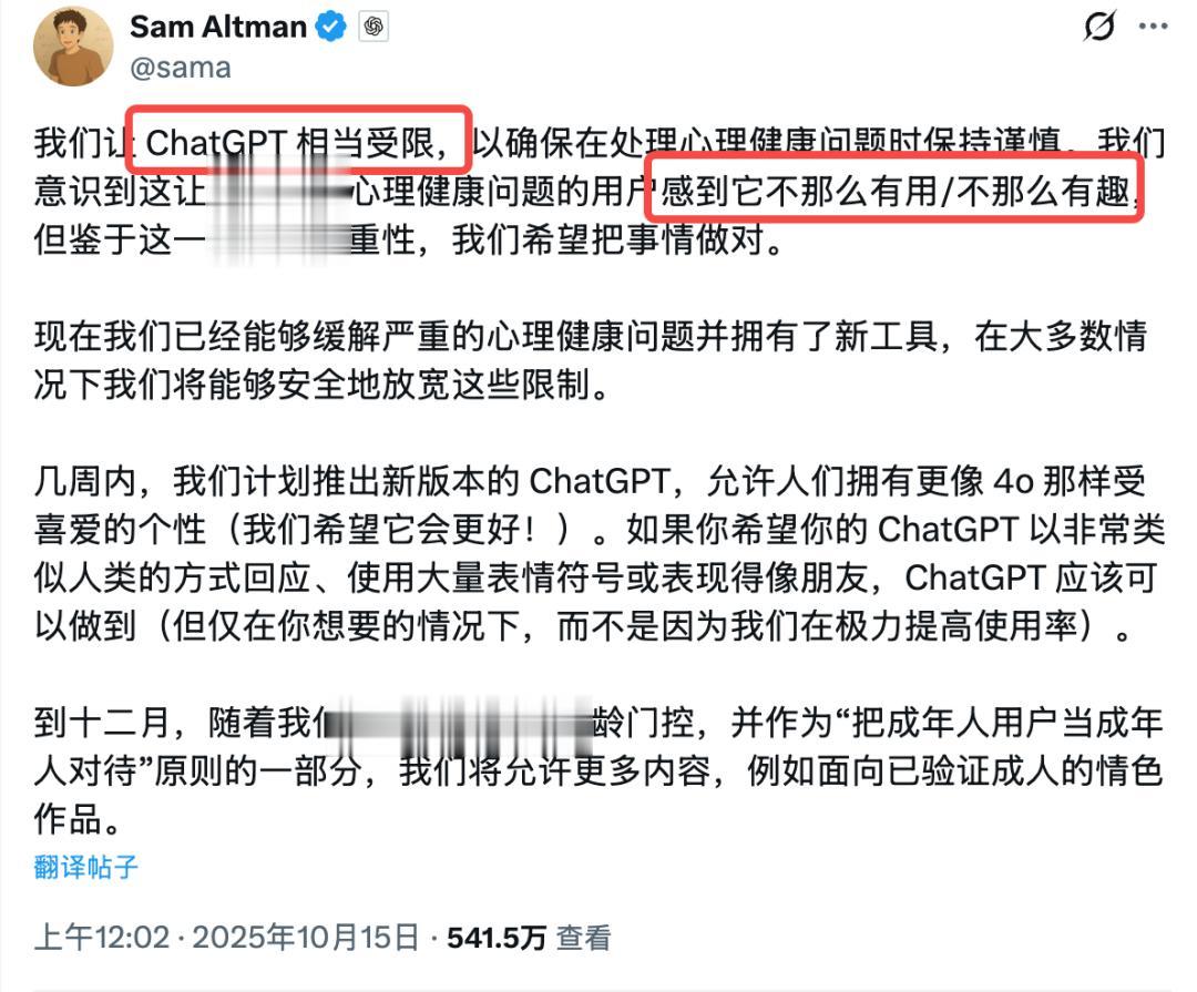 而现在呢,奥特曼和OpenAI从一个极力回避风险、甚至不惜牺牲用户体验的「卫道士」,逐渐变成一个小心翼翼地重新释放「人格」、试探「成人内容」的追随者。